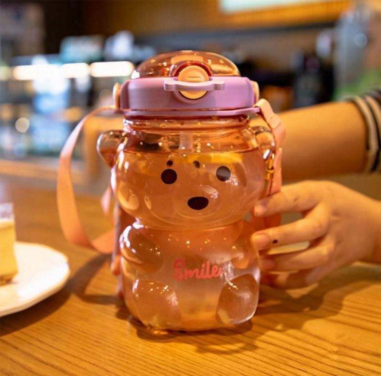 ขวดน้ำสำหรับเด็ก ขนาด 1 ลิตร ลายหมีคาวาอี้ พร้อมหลอดดูด