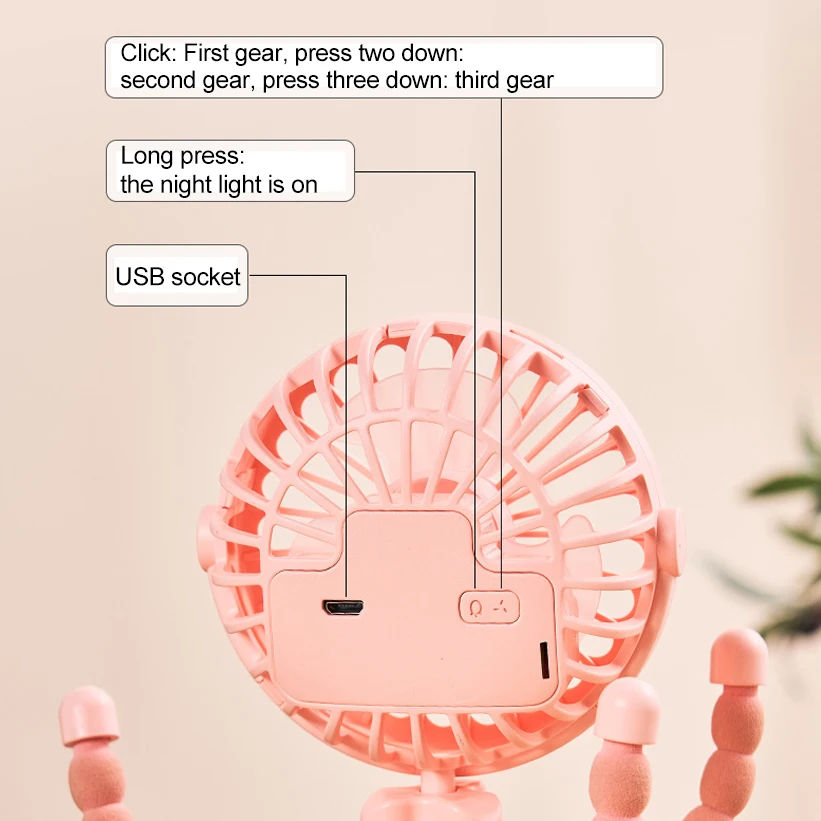 1ชิ้นพัดลมขนาดเล็กแบบมือถืออเนกประสงค์สำหรับรถเข็นเด็กแบบพกพาที่ชาร์จ USB ขาตั้งปลาหมึกมีสไตล์หลากหลายพร้อมไฟ LED