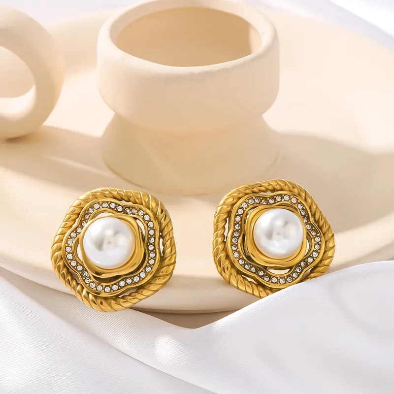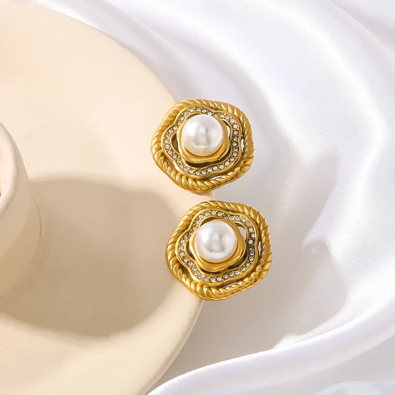 ต่างหูสแตนเลส304สไตล์ฝรั่งเศสย้อนยุค1คู่ฝังเพชรเรขาคณิตฝังเพชรทอง18K ฝังเพทายไข่มุกเทียม