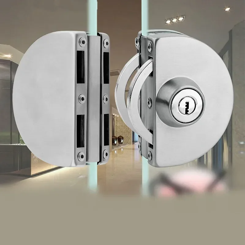 ชุดล็อคประตูบานเลื่อนแบบเปิดสองด้าน 1 ชุด ทนทาน ใช้กุญแจ ทำจากสแตนเลสขัดเงา พร้อมสลักคู่ สำหรับประตูบานเลื่อนขนาด 10-12 มม. เหมาะสำหรับสำนักงาน