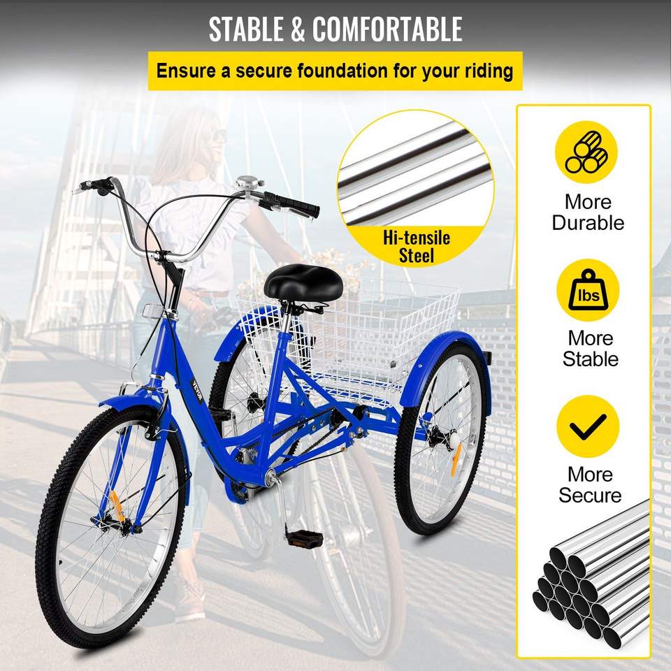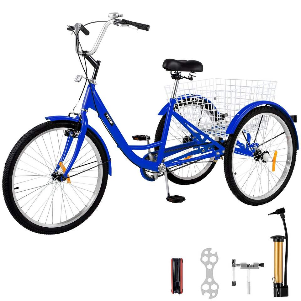 1-Speed 24\" Blue Adult Tricycle with Large Basket 3-Wheel Exercise Shopping Bicycle