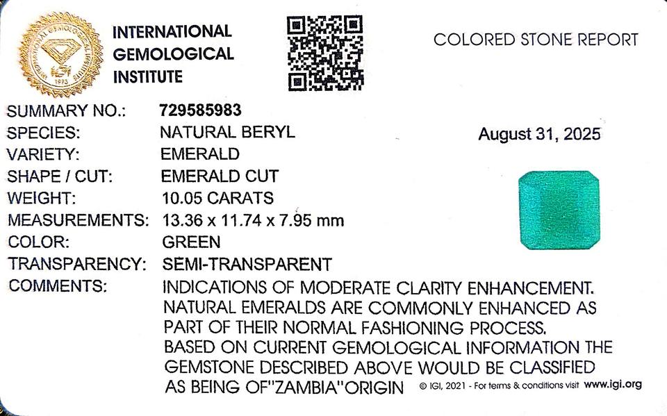 มรกตสีเขียวทรงแปดเหลี่ยม 10.05 กะรัต จากแซมเบีย พลอยหลวม รัตติชาร์ต 11.25