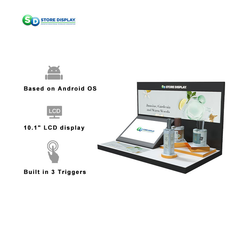 ขาตั้งจัดแสดงเครื่องสำอางอะคริลิคอัจฉริยะ10.1นิ้วมีไฟพื้นหลัง LED ขาตั้งอัจฉริยะสำหรับวางบนโต๊ะน้ำหอม