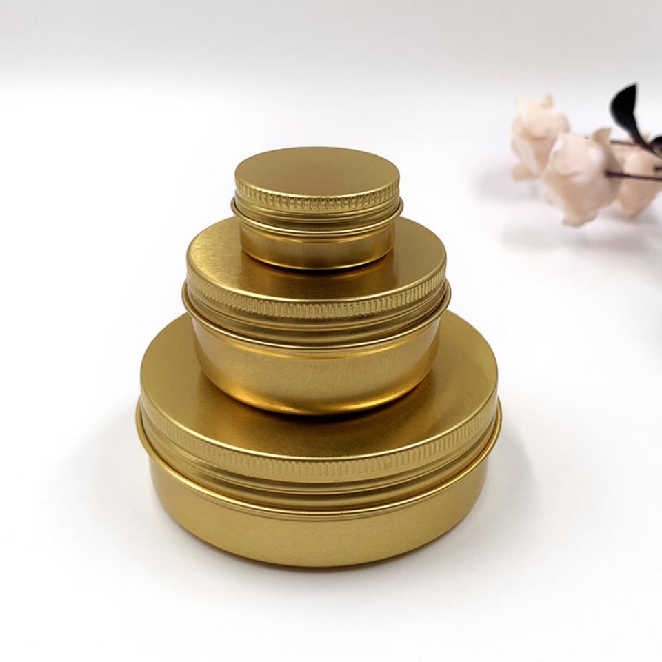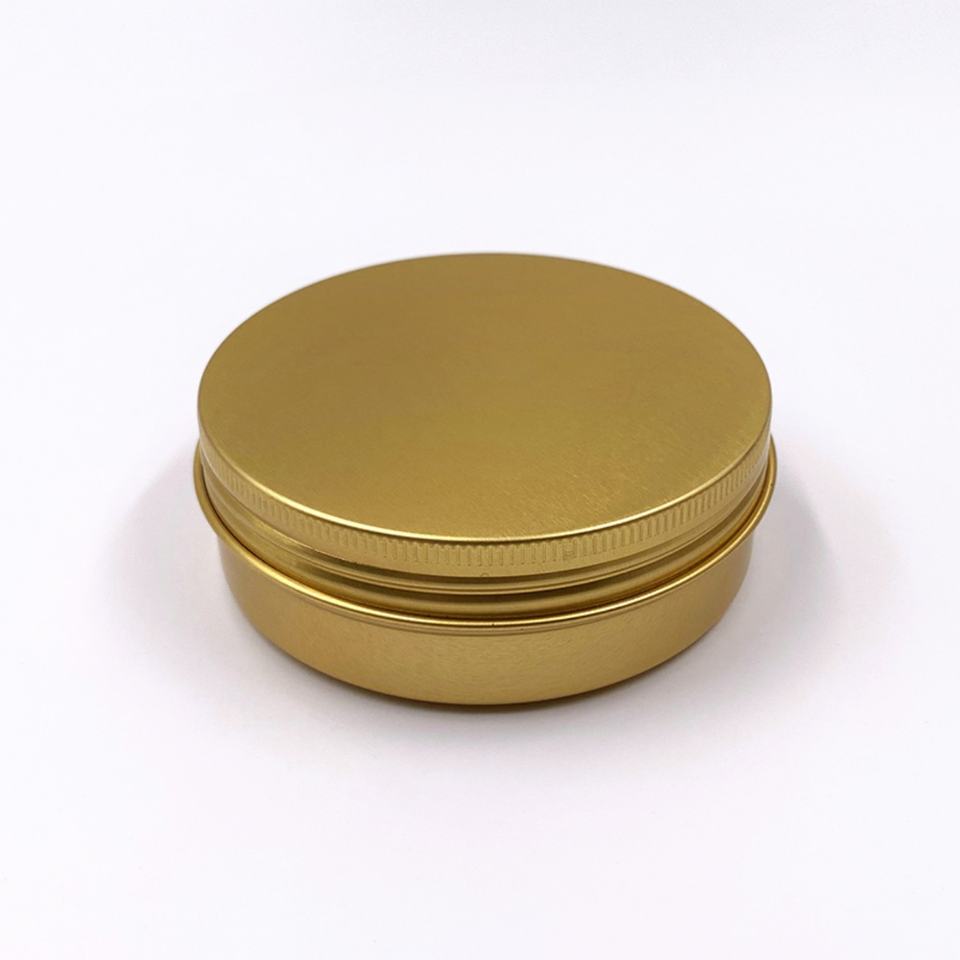 กระป๋องอะลูมิเนียมสีทองขนาด 10-150 มล. กล่องโลหะทรงกลมฝาเกลียว สำหรับเก็บชา ครีม บาล์ม แว็กซ์ เครื่องสำอาง