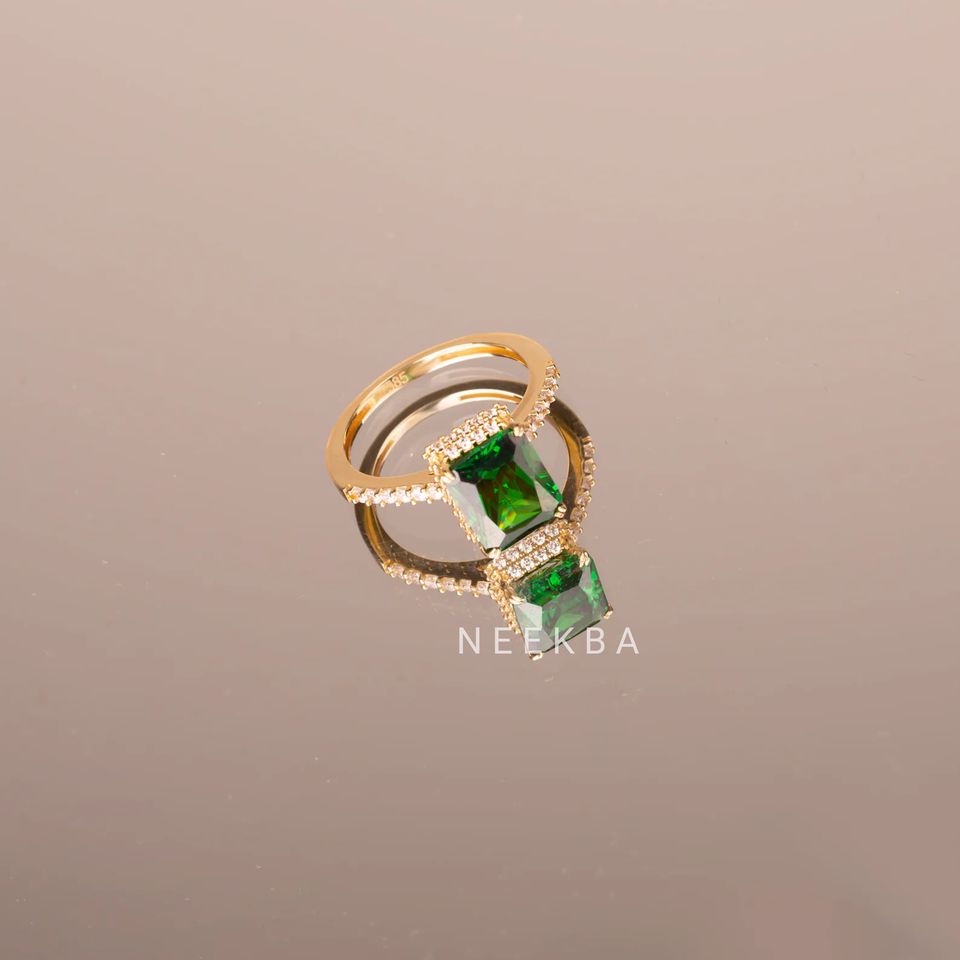 แหวนทองคำขนาด10*8มม. ทรงมรกต10K แหวนอัญมณีสีเขียวมรกตทำด้วยมือจากอินเดีย
