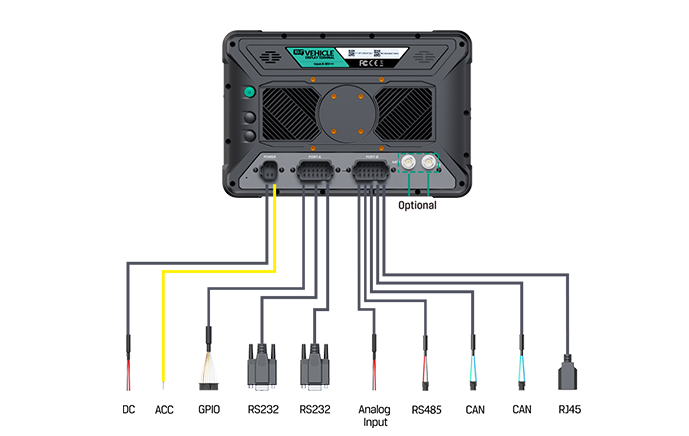 DC, USB, ACC, RS232, RS485, RJ45, CAN Bus, GPIO และอื่นๆ