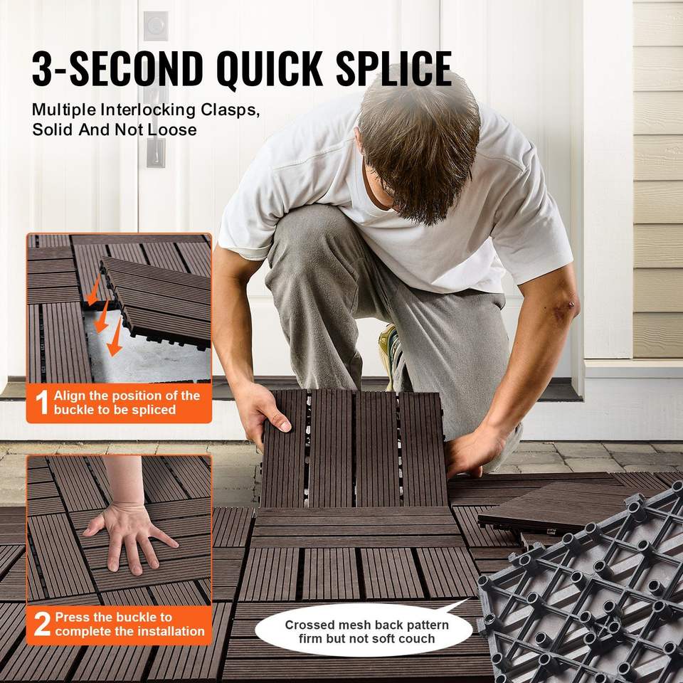 กระเบื้องปูพื้นแบบประกบ 10 ชิ้น ขนาด 12"x12" พลาสติกไม้ 10 ตร.ฟุต พื้นกันน้ำสำหรับกลางแจ้ง ทนทานทุกสภาพอากาศ เหมาะสำหรับปูพื้นระเบียงและพื้นไม้เทียม