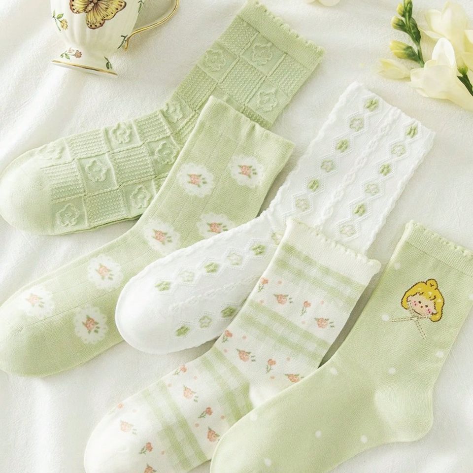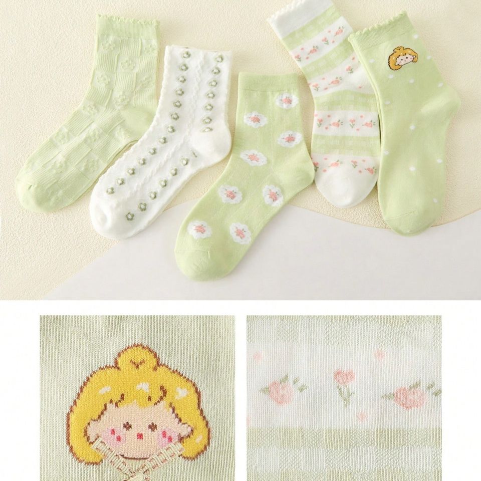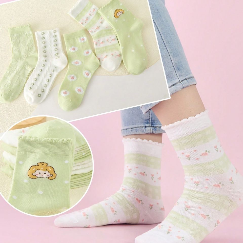 10 Pairs Women's Cartoon Crew Socks with Pleated Lace Design, Soft and Comfortable, Sweet Style Ankle Socks for Girls