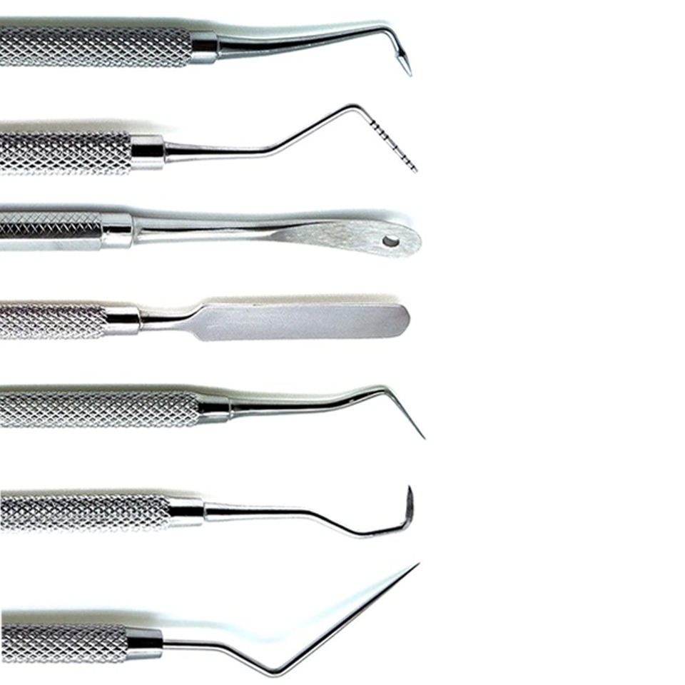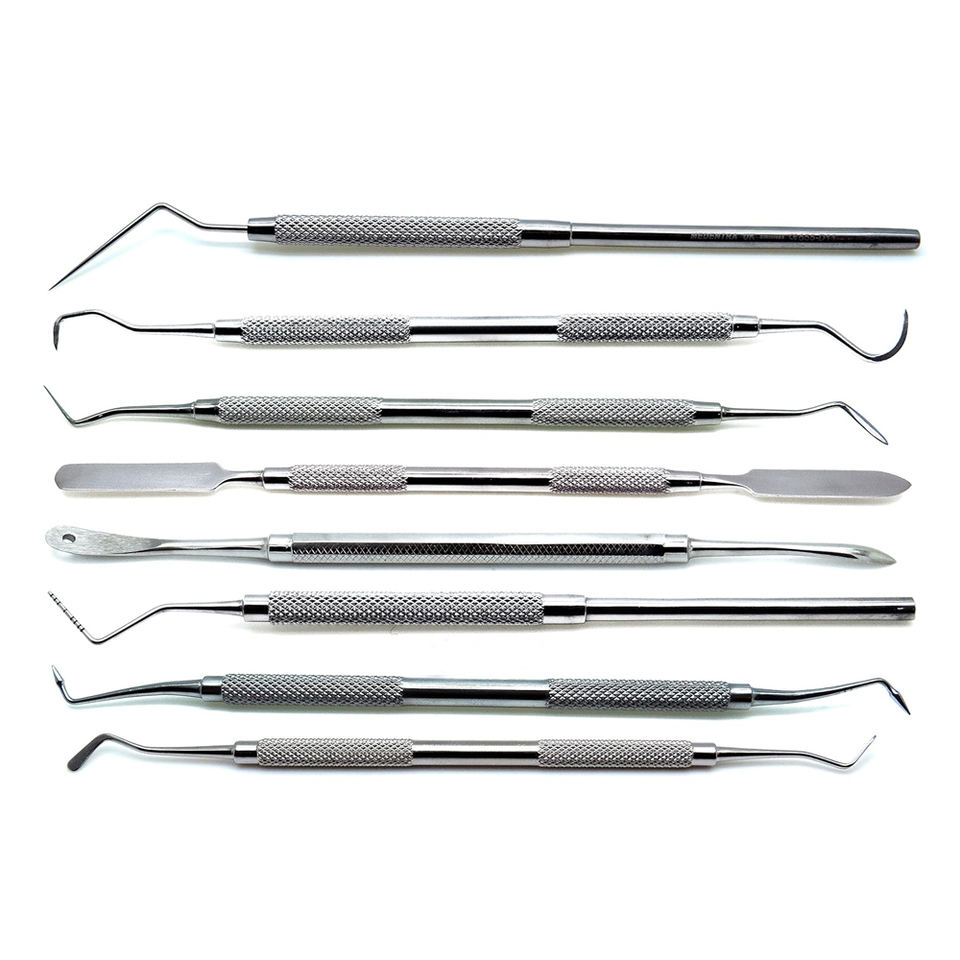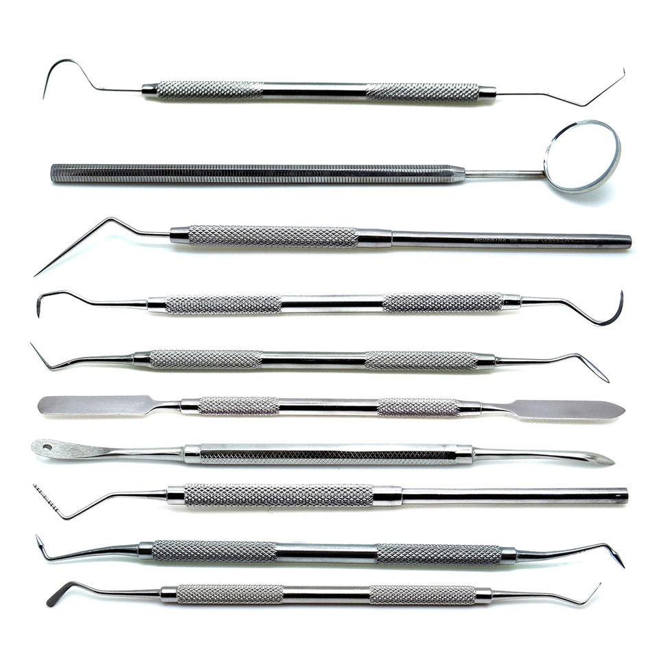 ชุดตรวจฟัน 10 ชิ้น ประกอบด้วยเครื่องมือสำรวจ เข็มเจาะ ไม้พาย และเครื่องมืออุดฟัน ผลิตจากเหล็กกล้าไร้สนิมเยอรมัน สำหรับการผ่าตัดทางทันตกรรม
