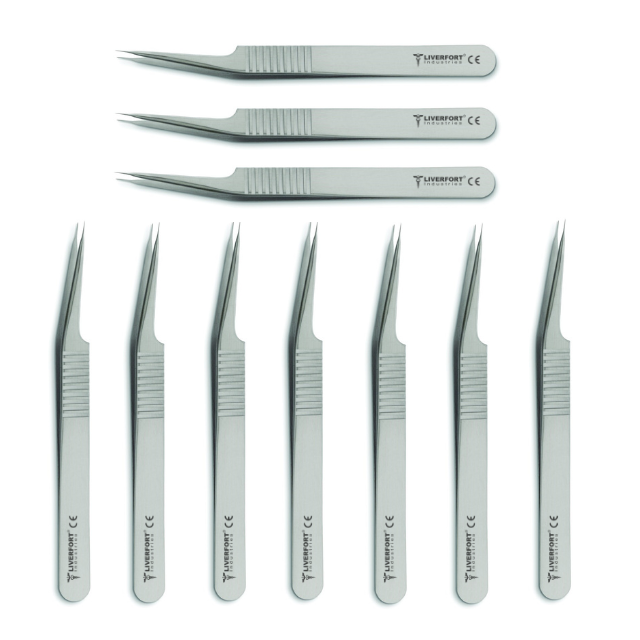 ชุดเครื่องมือขยายหลอดเลือดแบบมีมุม 10 ชิ้น ขนาดปลาย 0.3 มม. ยาว 12 ซม. แหนบขนาดเล็กสำหรับศัลยกรรมตกแต่งใบหน้า วัสดุสแตนเลส ได้รับมาตรฐาน CE