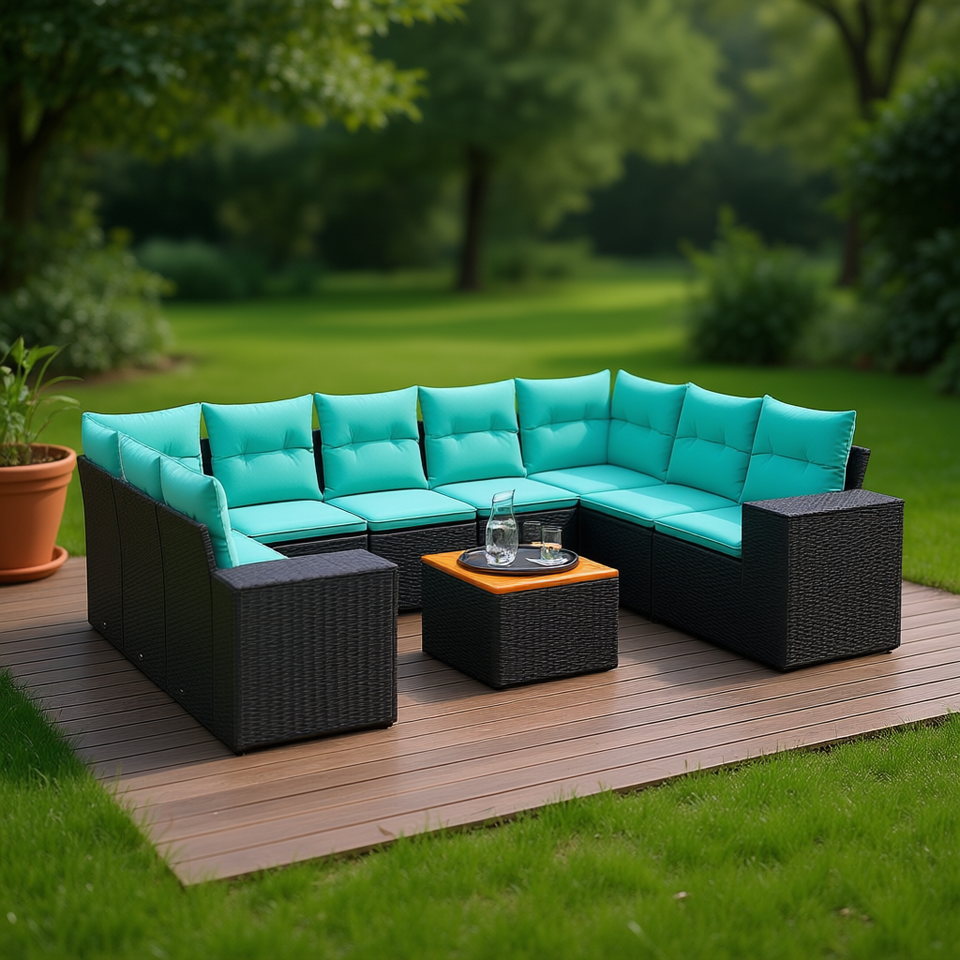 ชุดโซฟาสวนหวายโพลีสีดำพร้อมเบาะรองนั่ง เฟอร์นิเจอร์กลางแจ้ง 10 ชิ้น ดีไซน์ร่วมสมัย