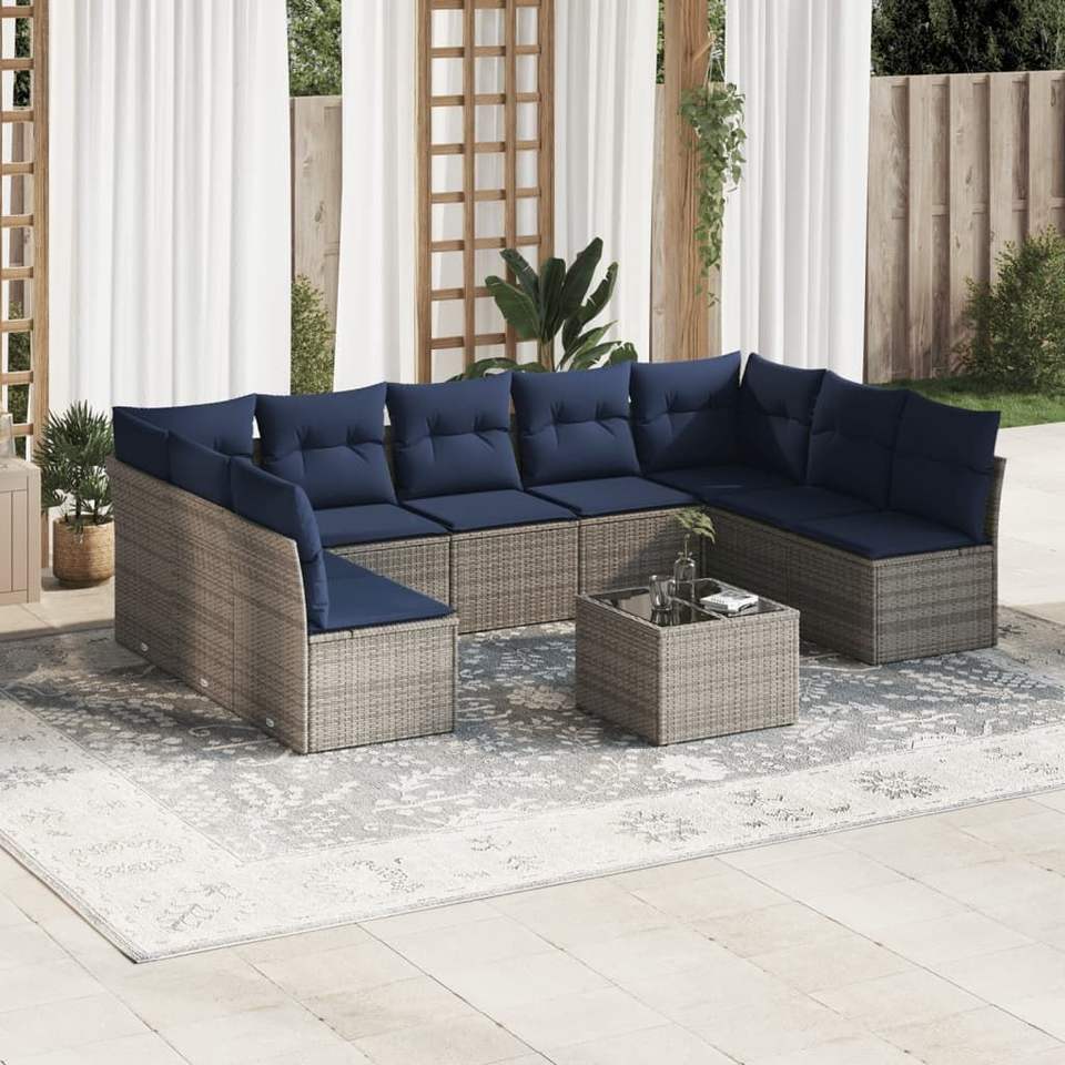 ชุดโซฟาลานบ้านหวายโพลีสีเทา 10 ชิ้นพร้อมชุดเบาะรองนั่งในสวน