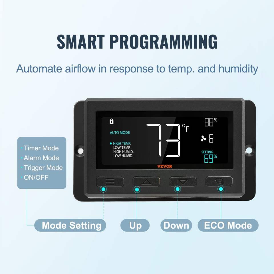 พัดลมระบายอากาศติดผนังแบบปรับได้ 10 ระดับ 820 CFM พร้อมตัวควบคุมอุณหภูมิและความชื้น 10 ระดับ มอเตอร์ EC