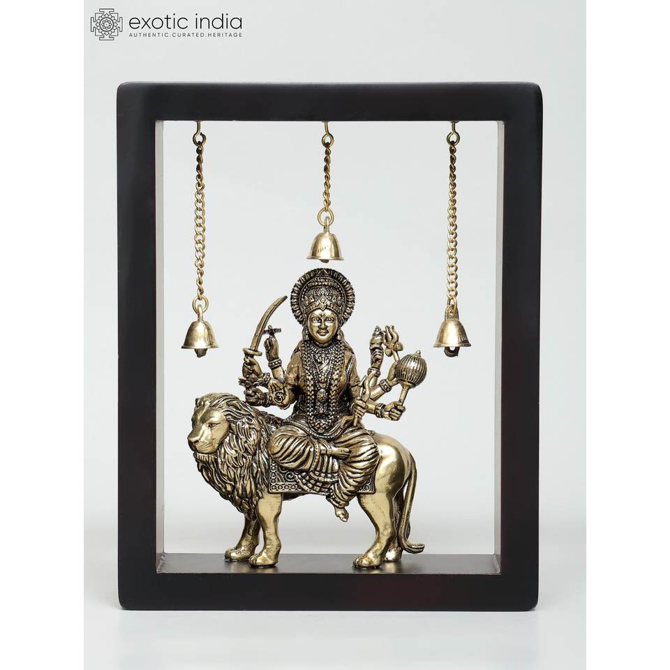 10\" Superfine Brass Sculpture Goddess Durga (Sherawali Maa) Wall Hanging with Dangling Bells Wood Framed Artwork