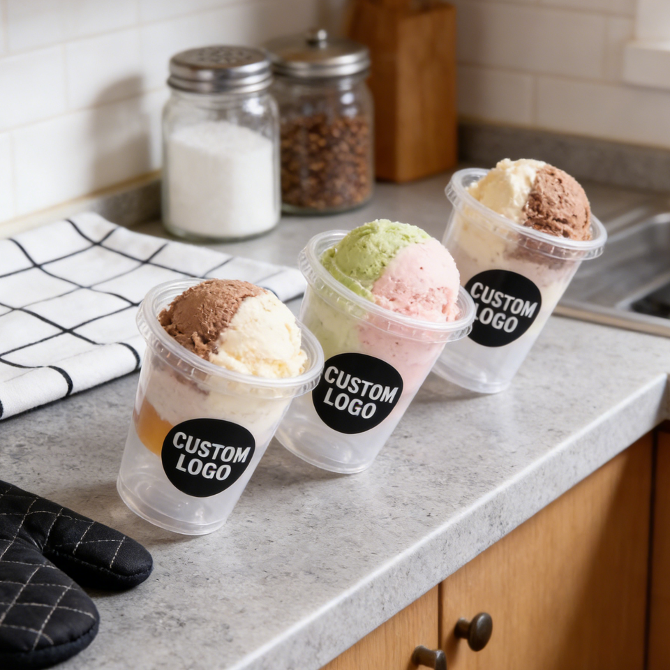 ผู้ผลิตและจำหน่ายถ้วยไอศกรีมและของหวานแบบใช้แล้วทิ้ง ขนาด 10 ออนซ์ ผลิตจากพลาสติก PET แบบผนังเดียว ขนาด 90 มม. พร้อมโลโก้สั่งทำได้