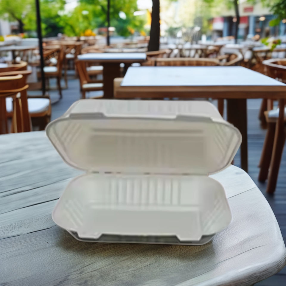 กล่องอาหารกลางวันจากชานอ้อยแบบใช้แล้วทิ้ง ย่อยสลายได้ 100% ขนาด 9x6 นิ้ว ภาชนะบรรจุอาหารแบบฝาพับ ปราศจากสาร PFAS สำหรับอาหารแบบกลับบ้าน