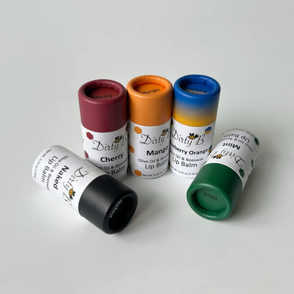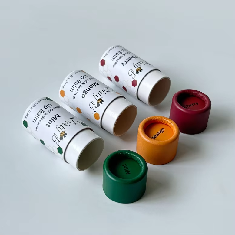 บรรจุภัณฑ์ลิปบาล์มแบบกระดาษแข็งทรงกระบอกแบบกดใช้ซ้ำได้ ผลิตด้วยมือ คุณภาพสูง ปรับแต่งได้ ย่อยสลายได้ 100% และรีไซเคิลได้