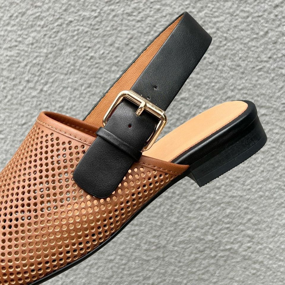 รองเท้าแตะส้นเตี้ยแบบสวมสำหรับผู้หญิง หนังลูกวัวแท้ 100% พื้นรองเท้าหนังแกะ ดีไซน์แบบโปร่ง สายรัดกว้าง แฟชั่นทันสมัย กันลื่น