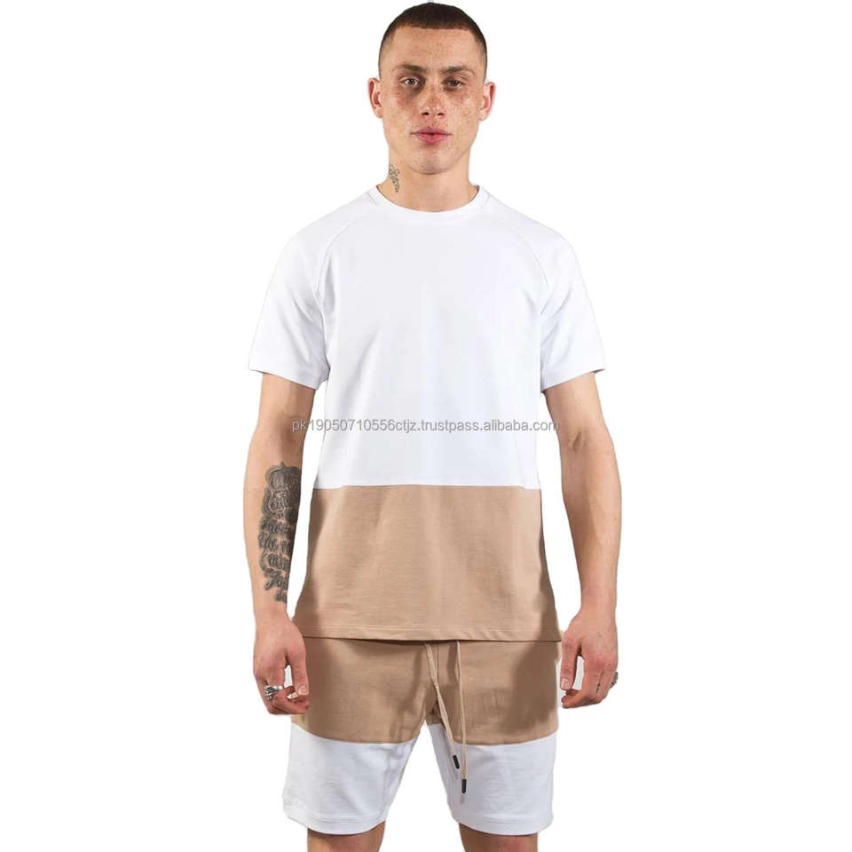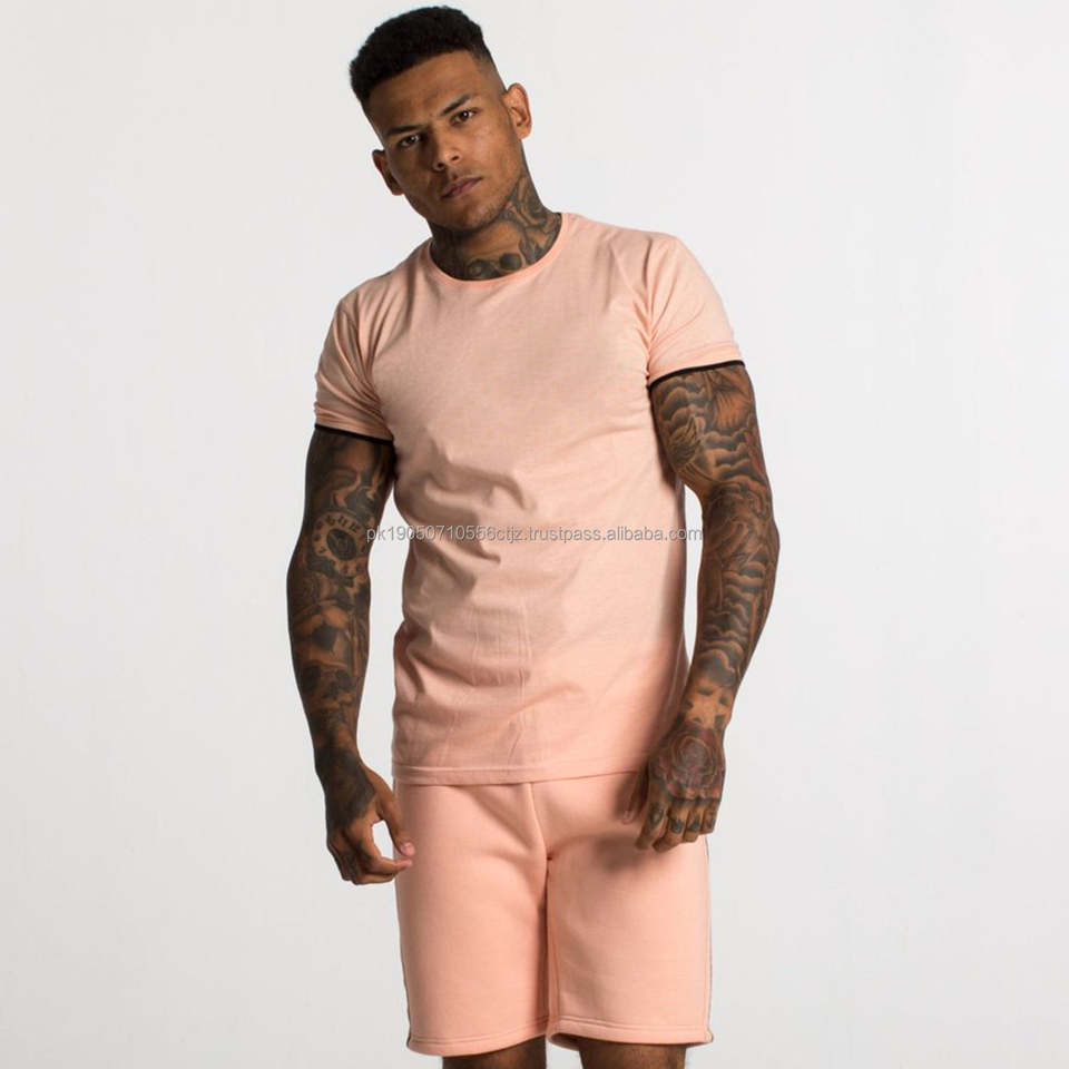 เซ็ตเสื้อยืดและกางเกงขาสั้นคอกลมแขนสั้นพอดีตัว100% ผ้าคอตตอนชุดเสื้อยืดและกางเกงขาสั้นสำหรับผู้ชาย twinset คุณภาพสูง