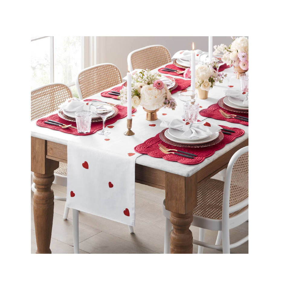 ผ้าปูโต๊ะสีขาวพิมพ์ลายหัวใจสีแดงสวยทำจากผ้าฝ้าย100% ผ้าสำหรับตกแต่งห้องรับประทานอาหารบ้านสมบูรณ์แบบนำมาใช้ใหม่ได้อย่างยั่งยืน