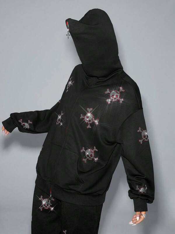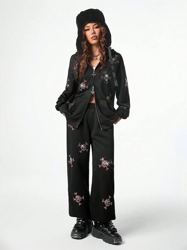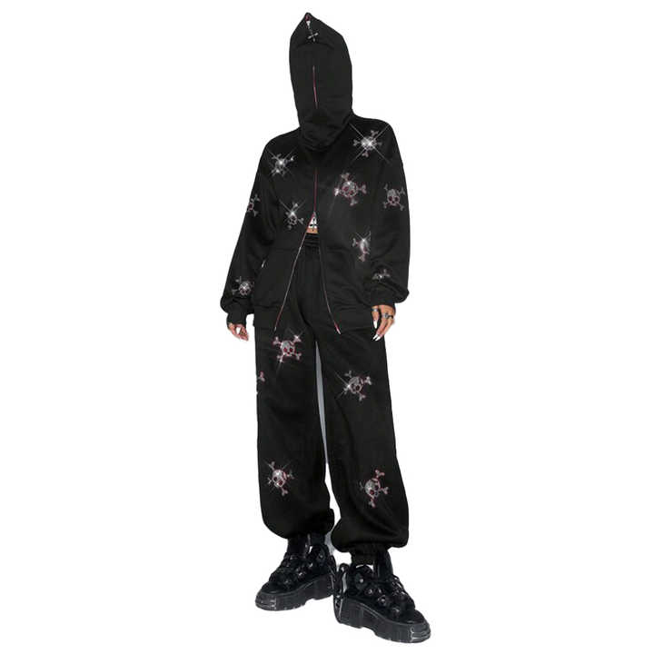 ชุดวอร์มฤดูหนาวผ้าฝ้ายแท้ 100% สีดำประดับเพชรเทียม ชุดเซ็ตฮู้ดดี้ซิปและกางเกงขายาว สไตล์สตรีทแวร์ ตกแต่งอย่างสวยงาม ชุดลำลอง 2 ชิ้น แฟชั่น Y2K