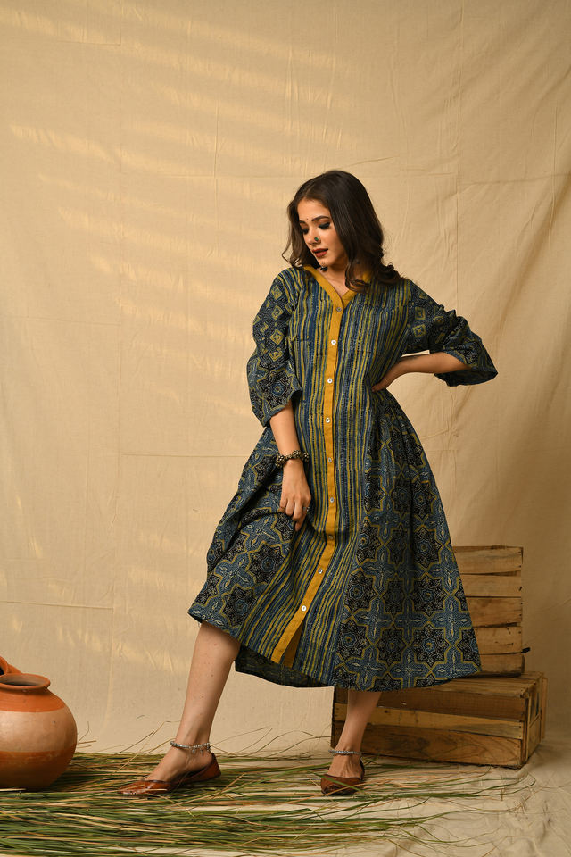 เดรสผ้าฝ้ายโบฮีเมียนพิมพ์ลายบล็อกสีครามสำหรับ100% เดรสมิดิทรงเรขาคณิต