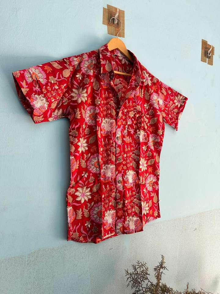 เสื้อเชิ้ตผู้ชายแขนสั้นคอวีลายดอกพิมพ์ลายด้วยมือจากผ้าฝ้าย 100% ระบายอากาศได้ดี เป็นมิตรกับสิ่งแวดล้อม เหมาะสำหรับวันหยุดฤดูร้อน