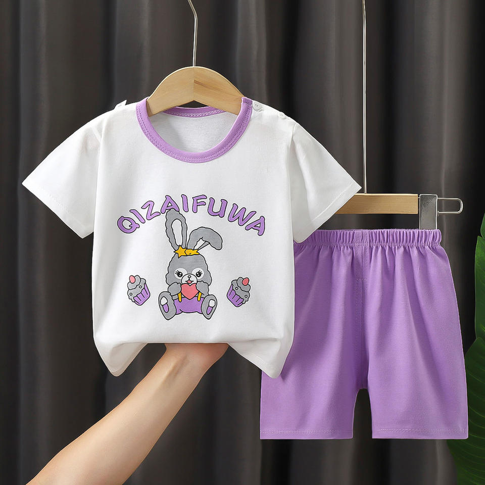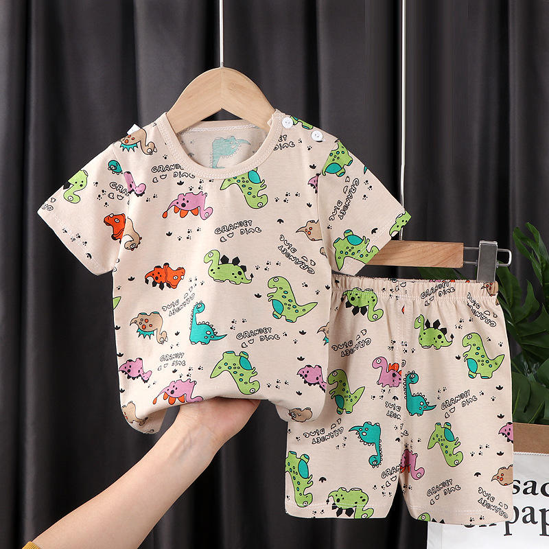 ผ้าฝ้าย 100% ลายการ์ตูนฤดูร้อนเด็กชายและเด็กหญิงชุดกางเกงขาสั้นแขนสั้นผ้าฝ้ายแท้ชุดเสื้อผ้าเด็ก