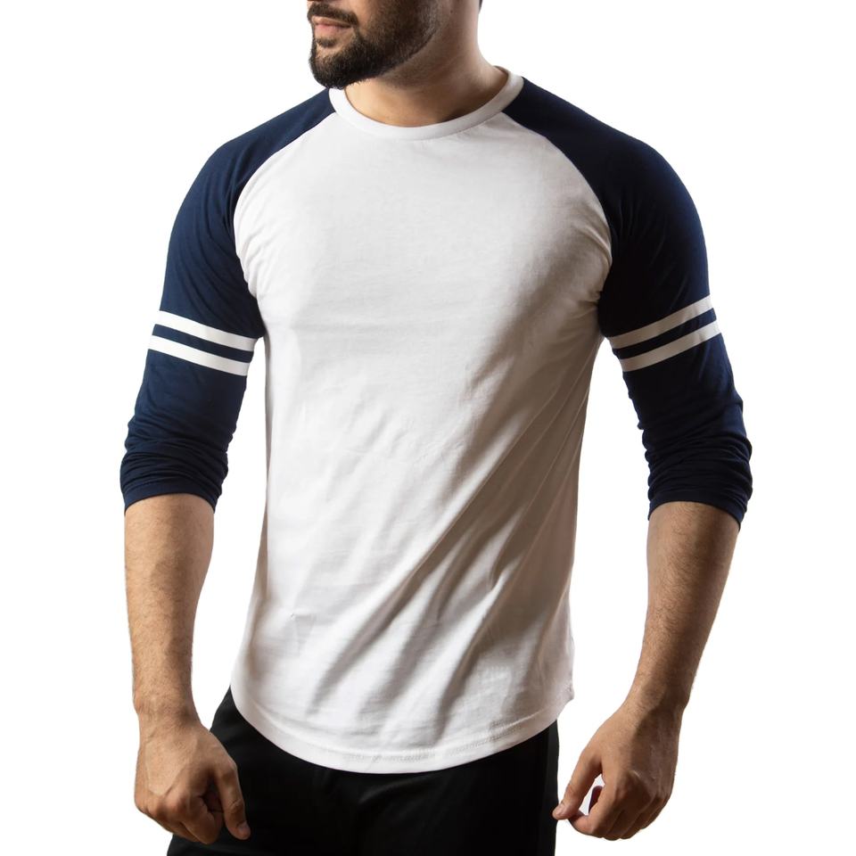 เสื้อยืดลำลองผู้ชายผ้าฝ้าย 100% ลายเรียบ สีตัดกัน ลายทาง คอเสื้อแบบแร็กแลน แขนยาว