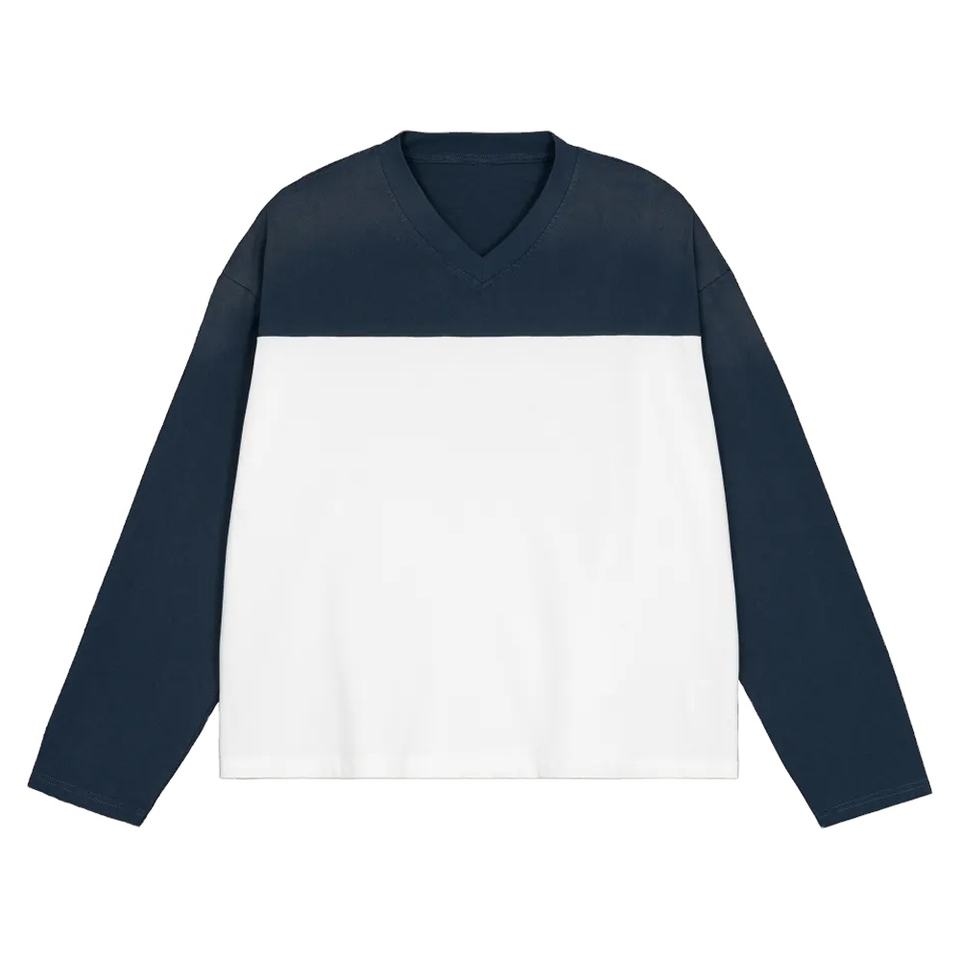 100% Cotton Custom Men Boxy T Shirt Long Sleeve V Neck Street Wear Layered Contrast Sleeve Customized printing 3D Embroidery