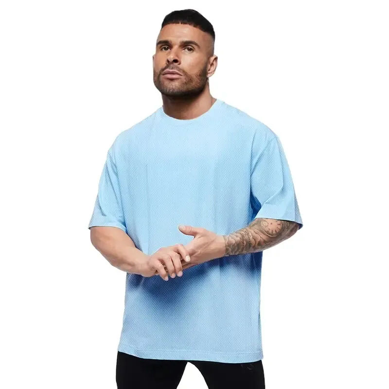เสื้อยืดผ้าฝ้าย100% ไหล่ตกคอกลมสำหรับผู้ชายไซส์ใหญ่พิเศษถักพิมพ์ลายโลโก้โอเวอร์ไซส์