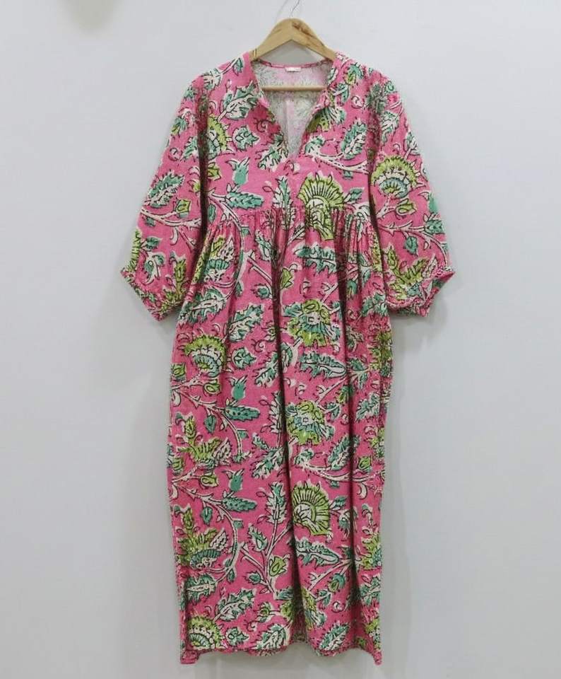 เดรสผ้าฝ้าย 100% ลายดอกไม้สไตล์อินเดีย สีสันสดใส ทรงเอไลน์ เอวธรรมชาติ ระบายอากาศได้ดี ความยาวปานกลาง เหมาะสำหรับฤดูร้อน ทำด้วยมือ เป็นมิตรต่อสิ่งแวดล้อม สไตล์โบโฮ