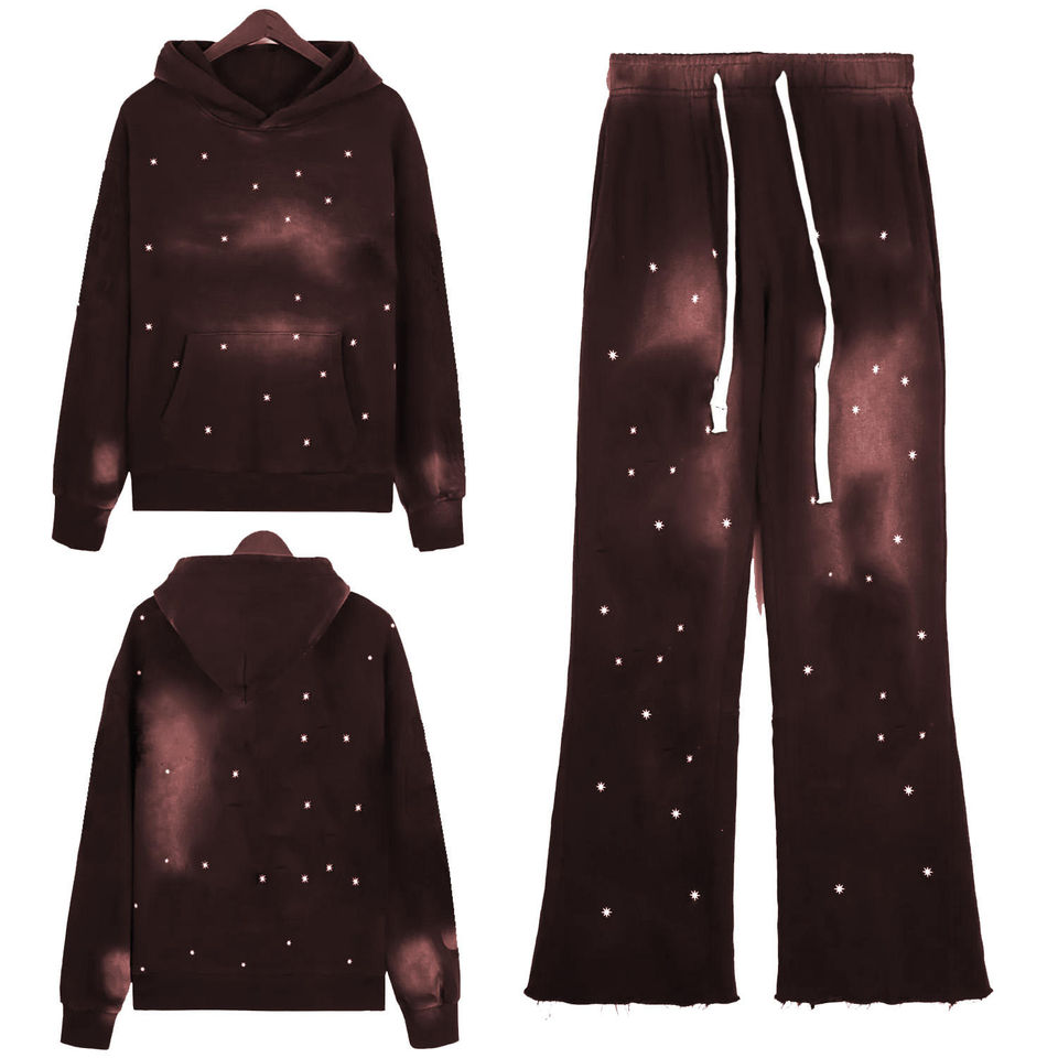 ชุดวอร์มผ้าฝ้ายฟลีซ 100% ปักลายแบบดิสเทรส ล้างสีแบบแอซิดวอช กางเกงวอร์มขาบานสำหรับฤดูหนาว ชุดวอร์มประดับเพชรสำหรับผู้ชาย
