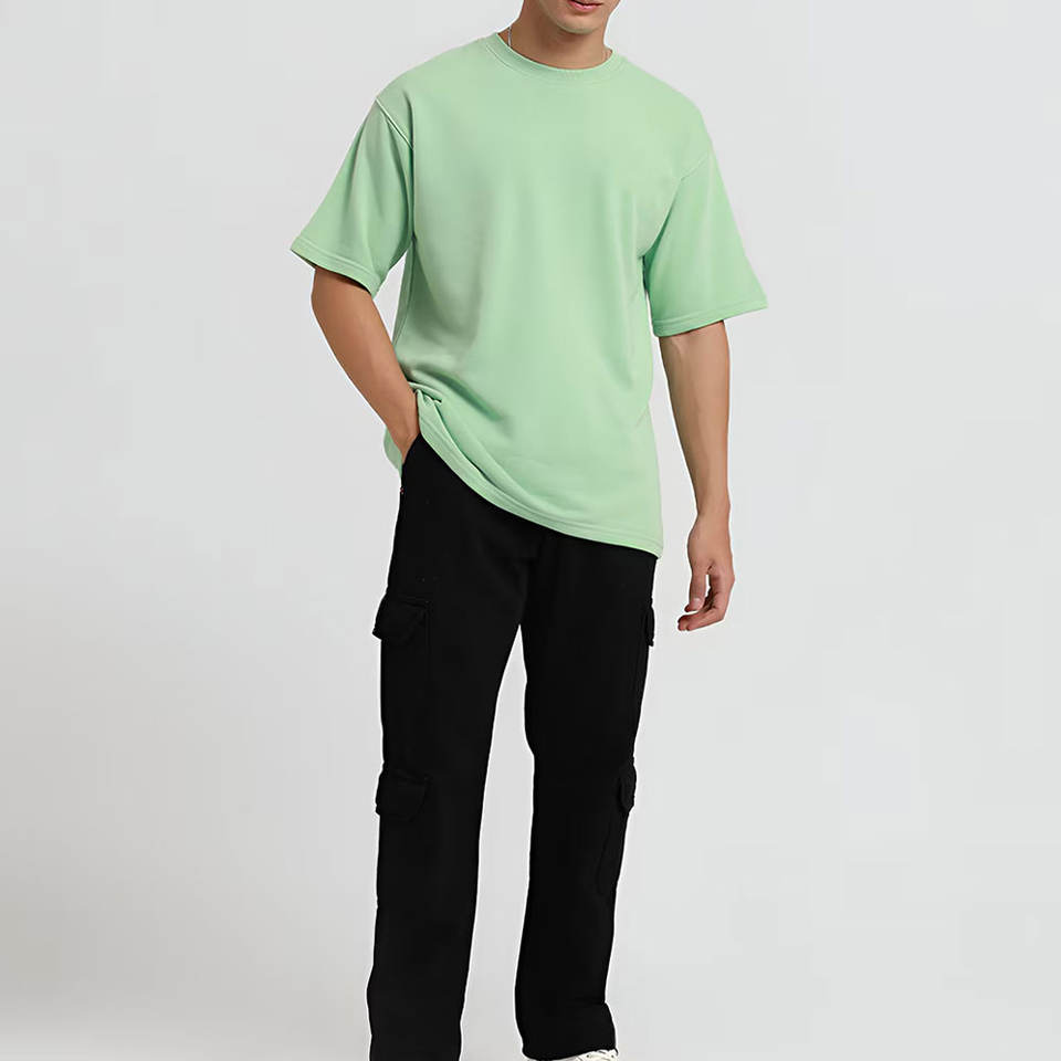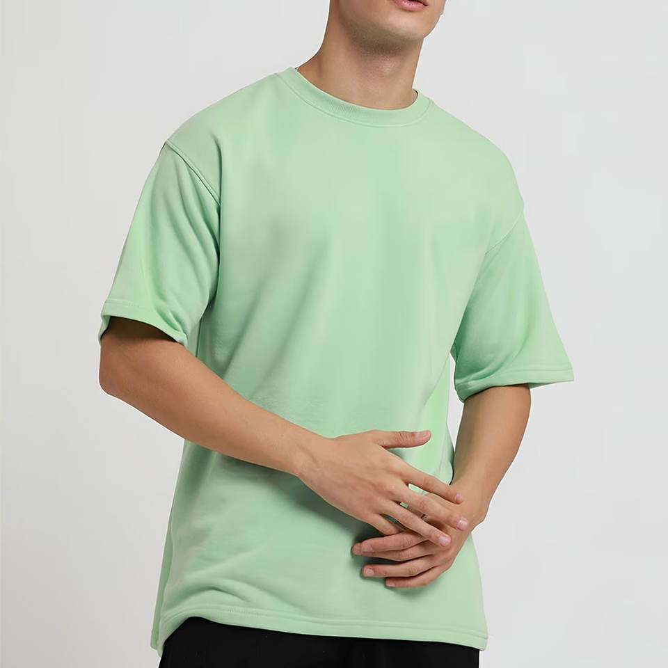 เสื้อยืดคอกลมทรงหลวมสำหรับผู้ชาย ผ้าเจอร์ซีย์คอตตอน 100% คุณภาพสูง ด้านหน้าเรียบ สามารถสกรีนโลโก้แบรนด์ของคุณได้ ผลิตจากผ้าถักเนื้อแน่น
