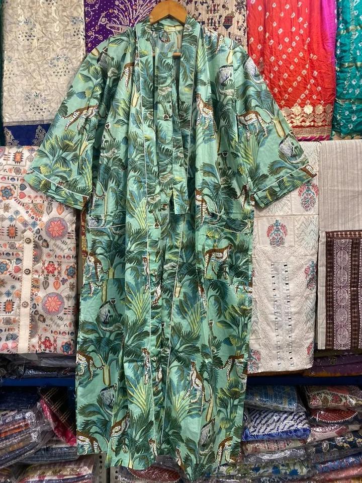 100% Cotton Block Print Cardigan Kimono Beach Bathrobe Nightwear Dressing Gown Spa Hotel Maternity Robe for Summer Spring