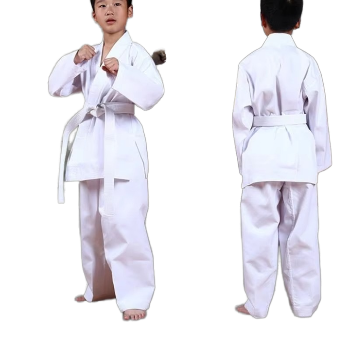 100% ชุดคาราเต้ผ้าฝ้ายน้ำหนักเบาสำหรับเด็กวัยรุ่นชุดศิลปะการต่อสู้แบบทึบมีเชือกผูกสำหรับคาราเต้เทควันโด