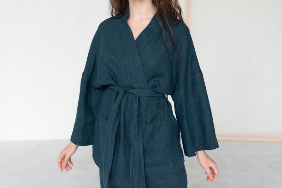 ชุดกิโมโนยาวถึงพื้นสำหรับผู้หญิงชุดผ้าลินินคอตตอนสีฟ้าสวมใส่สบายพร้อมกระดุมแบบธรรมชาติขนาดใหญ่ซักได้100%