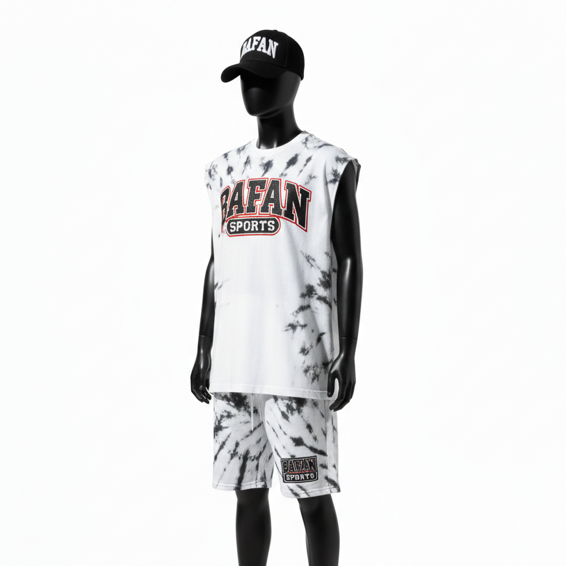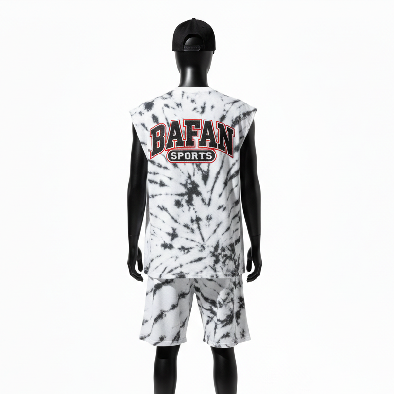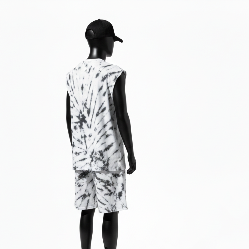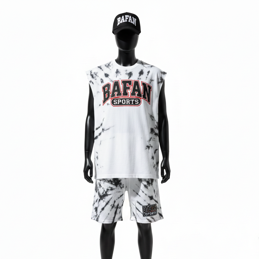 ชุดเซ็ตเสื้อกล้ามกางเกงขาสั้นผู้ชาย ผ้าฝ้าย 100% พรีเมียม คอตตอนเจอร์ซีย์ สีดำขาว ลายมัดย้อม พิมพ์ลายโลโก้ตามสั่ง ผ้าระบายอากาศได้ดี