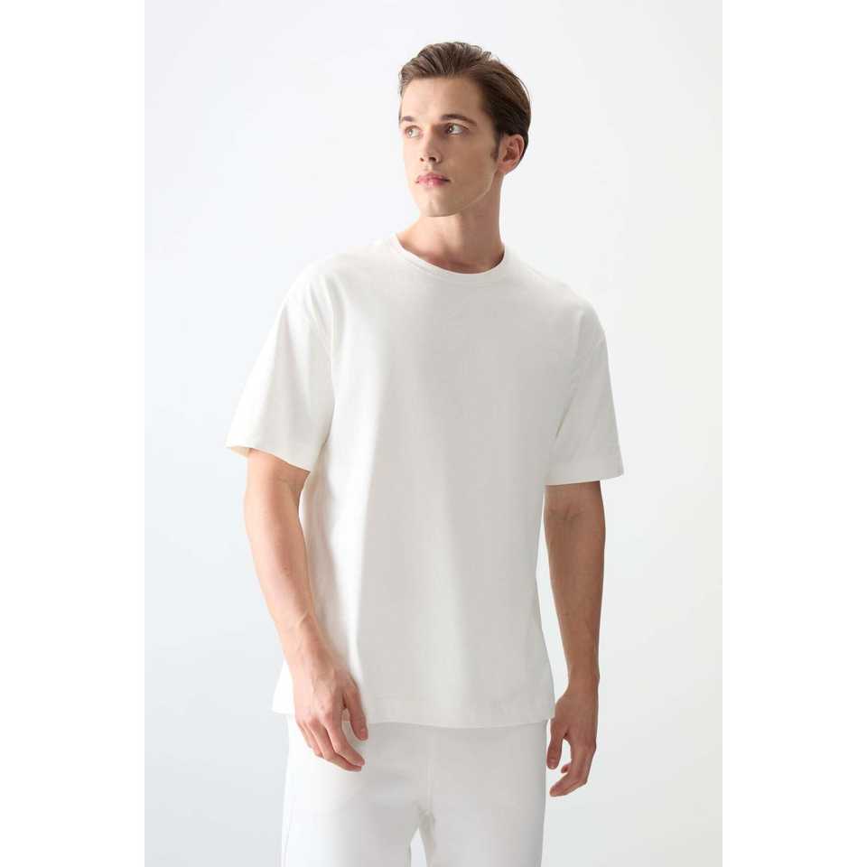เสื้อยืดผู้ชายผ้าฝ้าย 100% เนื้อหนานุ่ม ทรงโอเวอร์ไซส์ สีขาวนวล สไตล์เบสิค รุ่น 88353