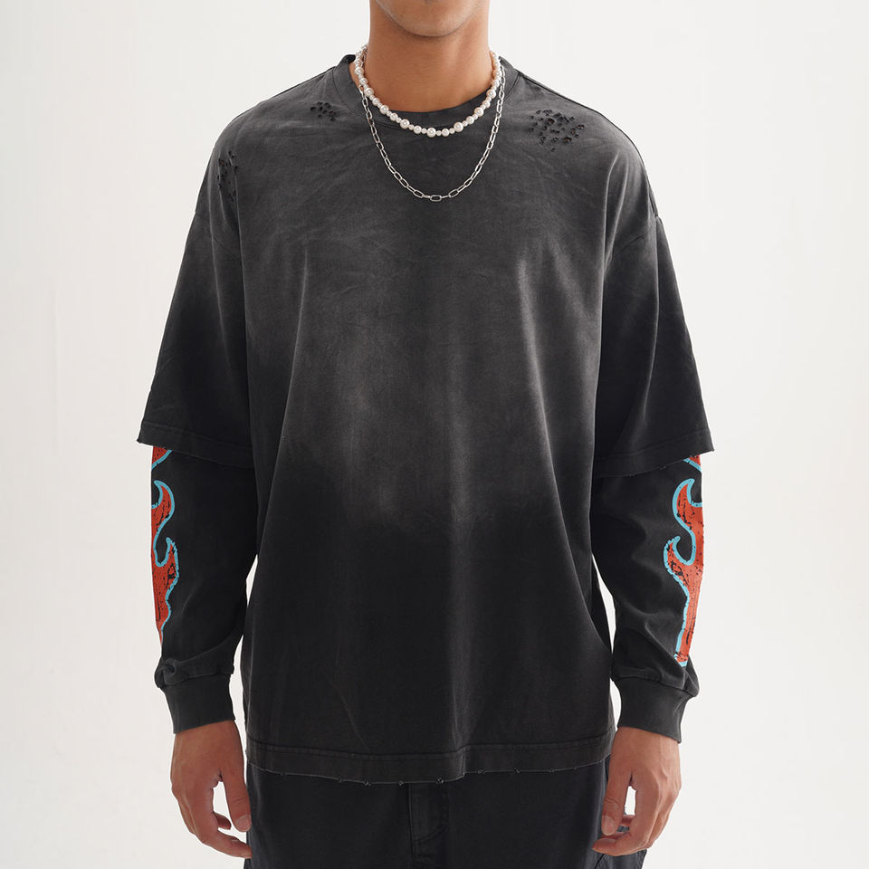 เสื้อยืดแขนยาวโอเวอร์ไซส์ผ้าฝ้าย 100% พิมพ์ลายกราฟิกแบบย้อมสีเอซิดสองชั้น สไตล์สตรีท ลุคซันเฟด ดีไซน์ขาดๆ สำหรับผู้ชาย