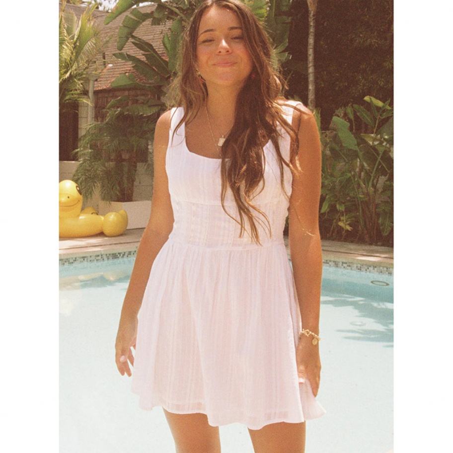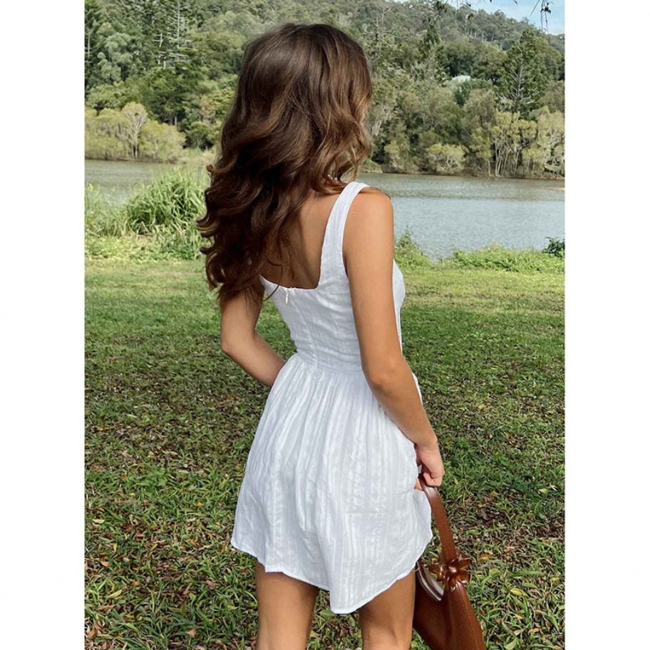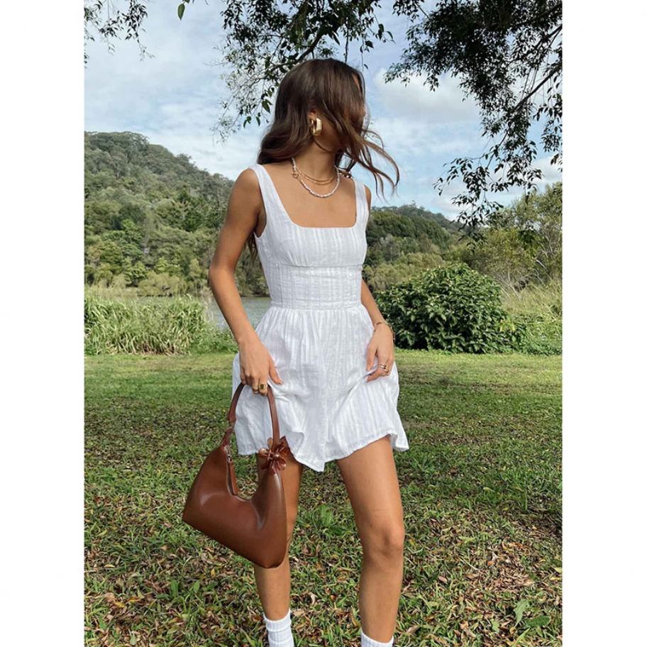 เดรสสั้นคอเหลี่ยมผ้าฝ้ายแท้ 100% สีขาวบริสุทธิ์ จับจีบช่วงเอว