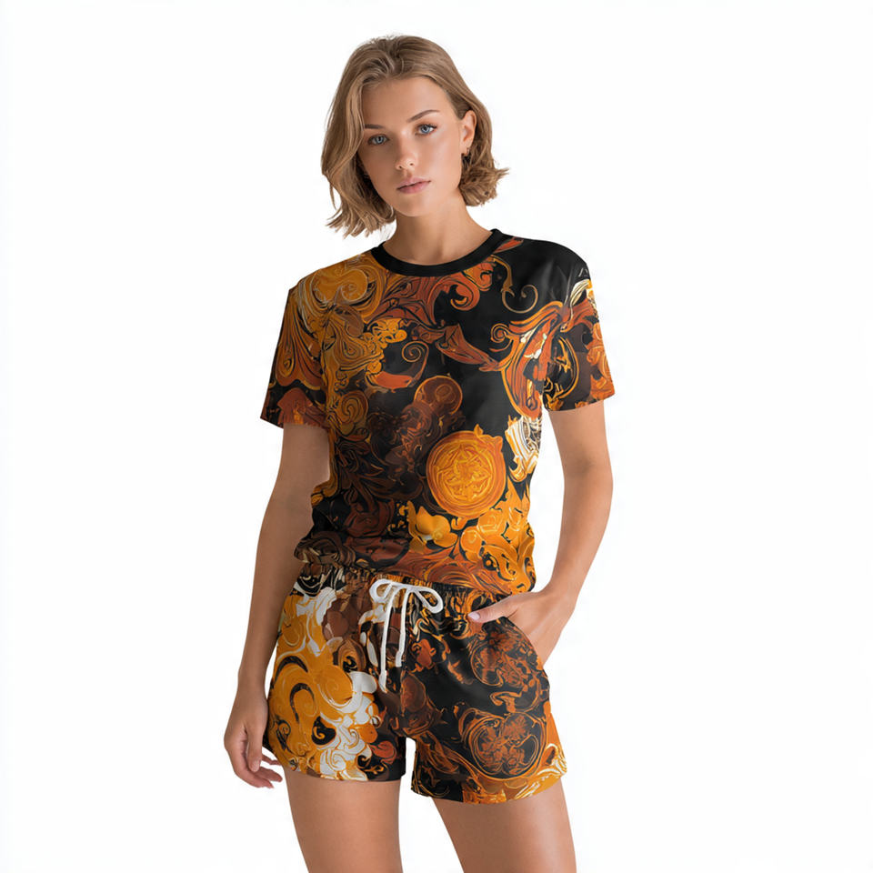 ชุดเสื้อยืดกางเกงขาสั้นผ้าฝ้าย100% ของผู้หญิงชุดกางเกงขาสั้นผ้าฝ้ายสองชิ้นพิมพ์ลายซับลิเมชันสำหรับฤดูใบไม้ผลิน้ำหนักเบาสำหรับฤดูร้อน