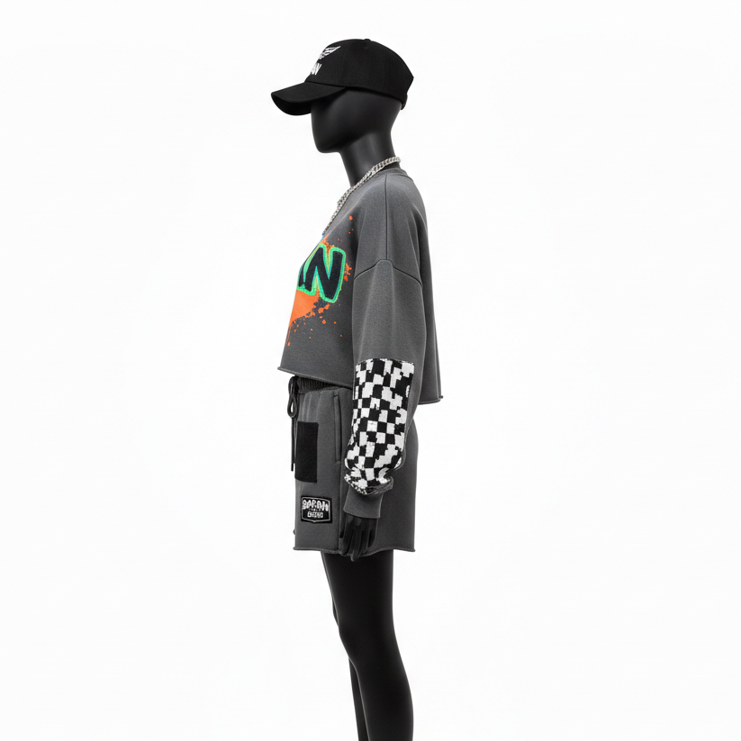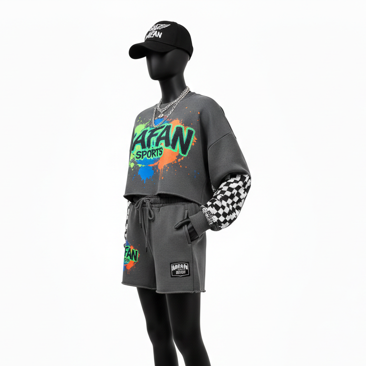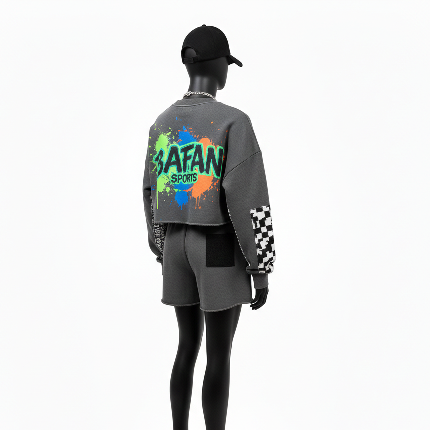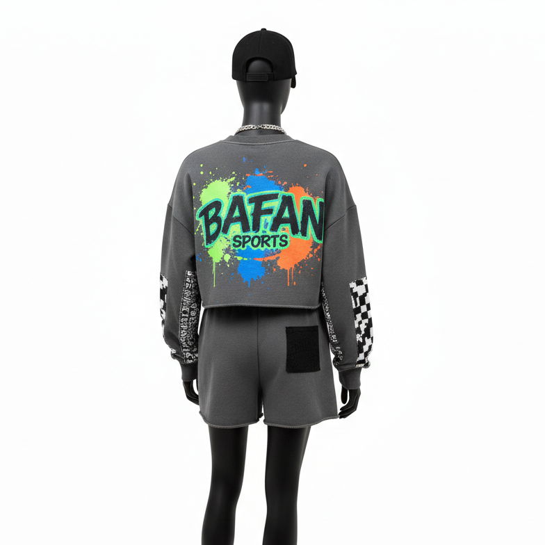 ชุดเซ็ตเสื้อสเวตเชิ้ตผ้าฟลีซคอตตอนคุณภาพสูงสำหรับผู้หญิง 100% ผ้าฝ้าย สีเทา พิมพ์ลายกราฟิก แขนเสื้อตัดต่อสีต่างกัน