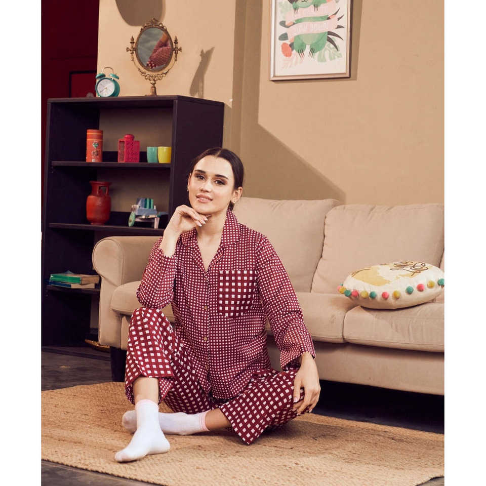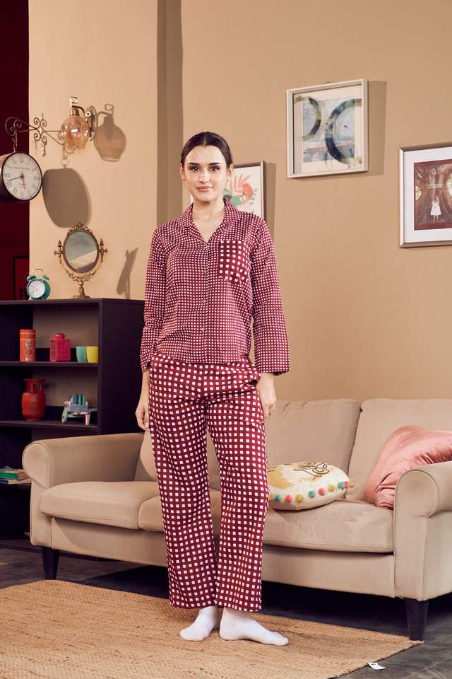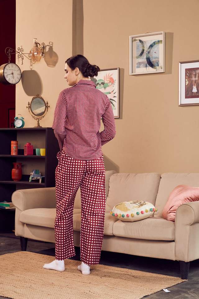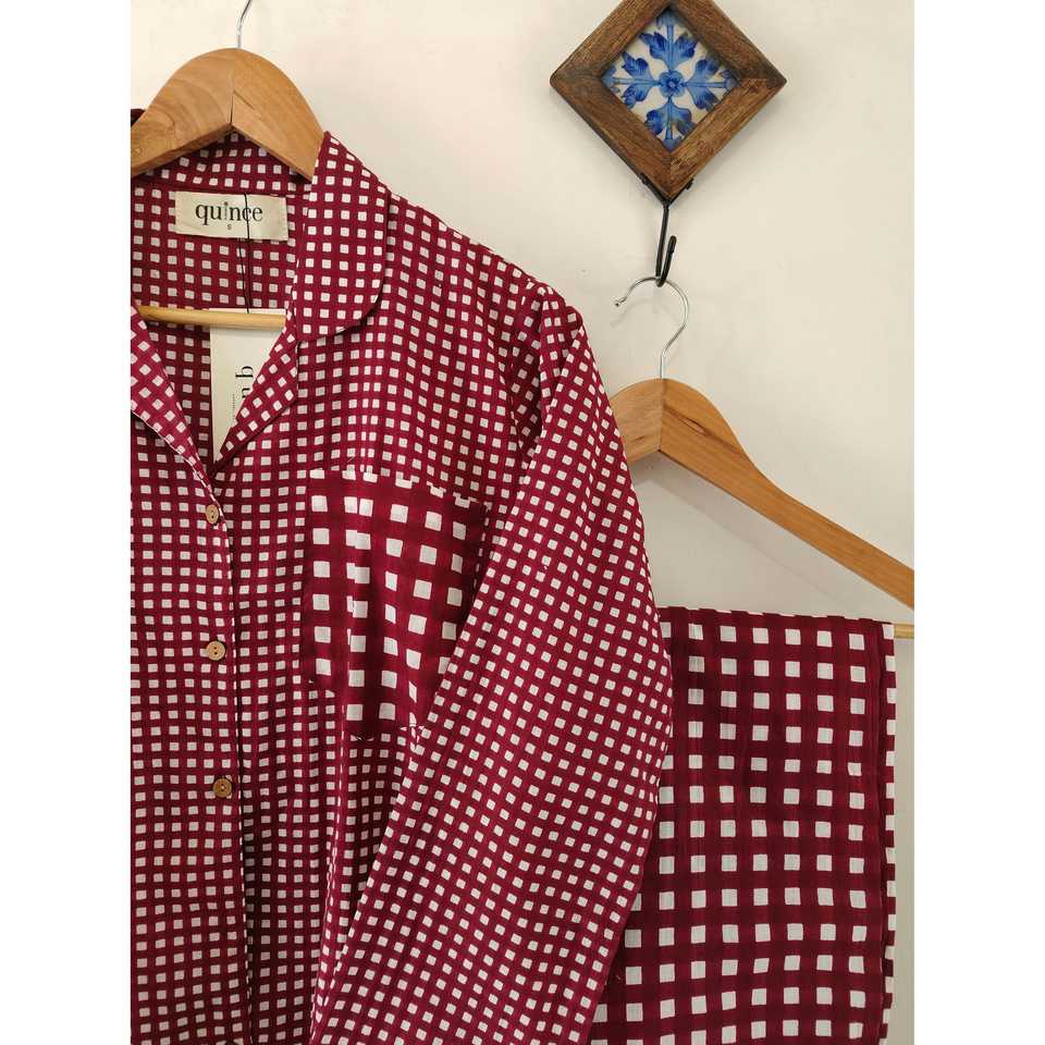 ชุดนอนผู้หญิงผ้าฝ้าย 100% สำหรับฤดูร้อน ชุดนอนลายตารางแขนยาว เนื้อผ้านุ่ม ระบายอากาศได้ดี แห้งเร็ว