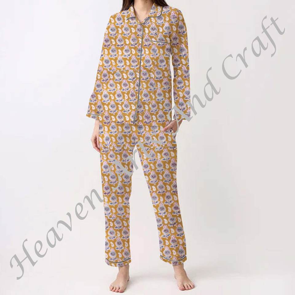 เซ็ตชุดนอนผู้หญิงผ้าคอตตอน100% ชุดชุดนอนชุดนอนผ้านุ่มใส่อยู่บ้านสำหรับฤดูใบไม้ผลิ/ฤดูร้อนลายดอกไม้/ตัวอักษร/ลวดลาย/วันหยุด/PJ029ลายต้นไม้