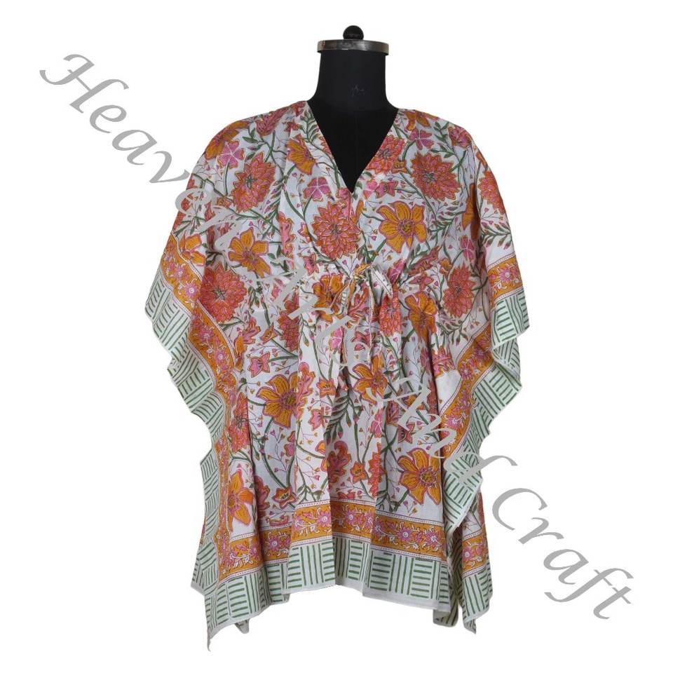ชุดนอนผู้หญิงผ้าคอตตอน100% ชุดเดรสคาฟตันพิมพ์ลายบล็อกมือสำหรับ KFCS177น้ำหนักเบาสวมใส่ในโอกาสลำลองชุดเดรสสั้นคัฟตัน