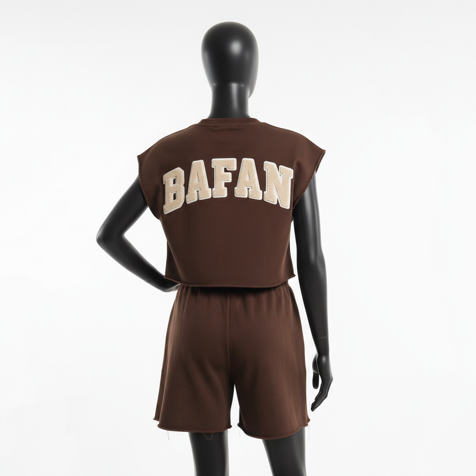 ชุดเสื้อครอปแขนกุดและกางเกงขาสั้นผ้าฝ้ายแท้ 100% สำหรับผู้หญิง ผ้าฝ้ายฟลีซพรีเมียม สีน้ำตาล ปักลายปักโลโก้ตามสั่ง