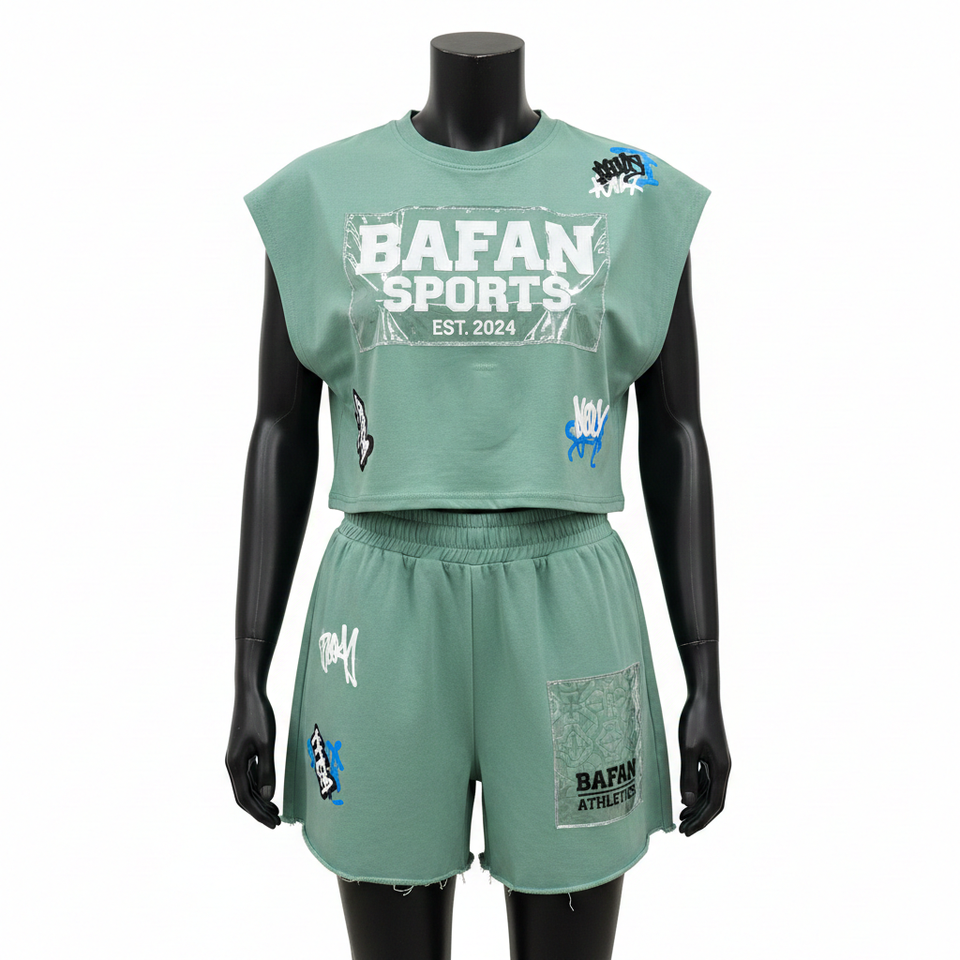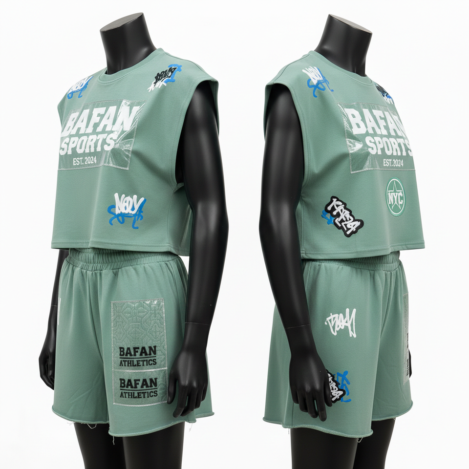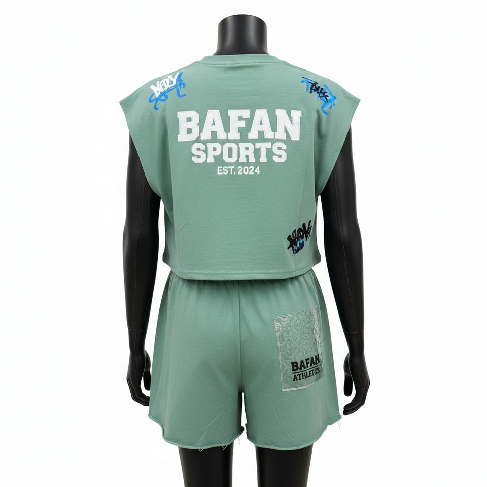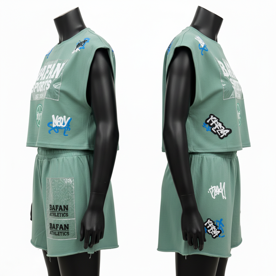 ชุดเสื้อยืดแขนกุดและกางเกงขาสั้นผู้หญิง ผ้าฝ้าย 100% 240 GSM ผ้าฝ้ายพรีเมียม สีเขียวเซจ แต่งแผ่นผ้าปะติด พิมพ์ลายตามสั่ง