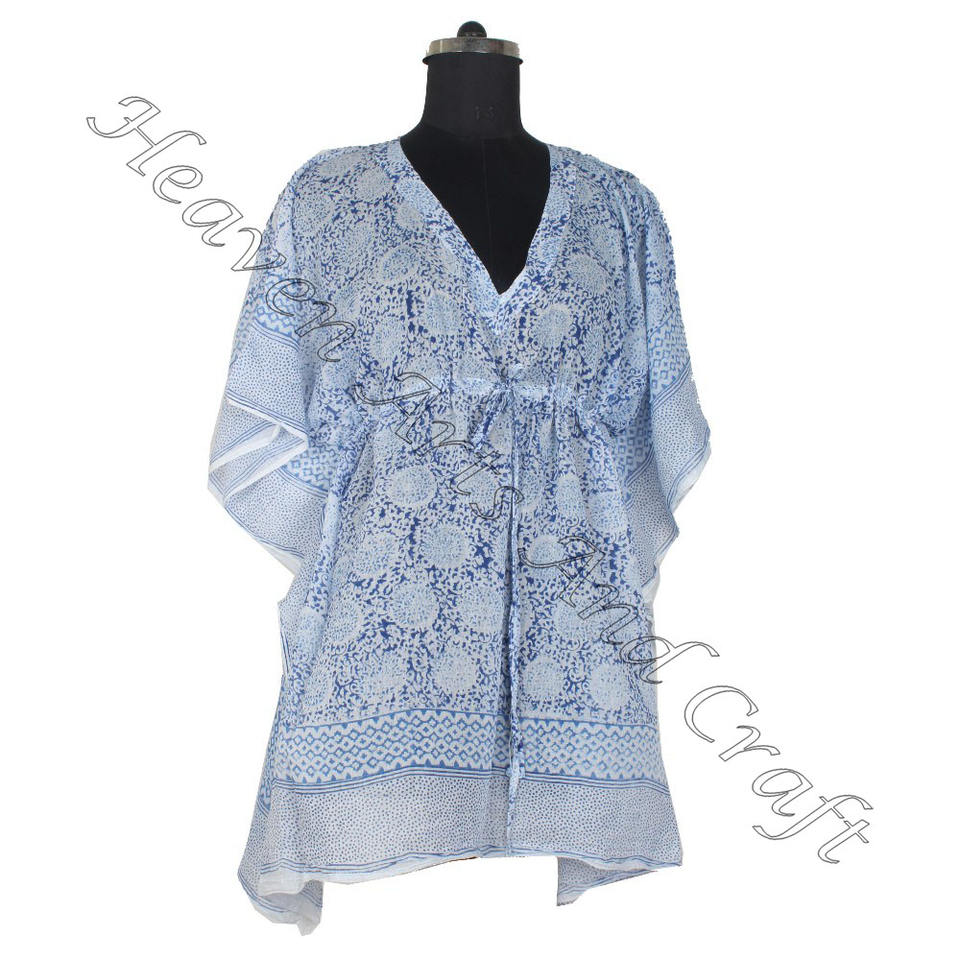ชุดเดรสคาฟตันผ้าฝ้าย100% สำหรับผู้หญิงชุดเดรสคาฟตันสั้นพิมพ์ลายบล็อกด้วยมือสำหรับงานปาร์ตี้สบายๆน้ำหนักเบาธรรมชาติ