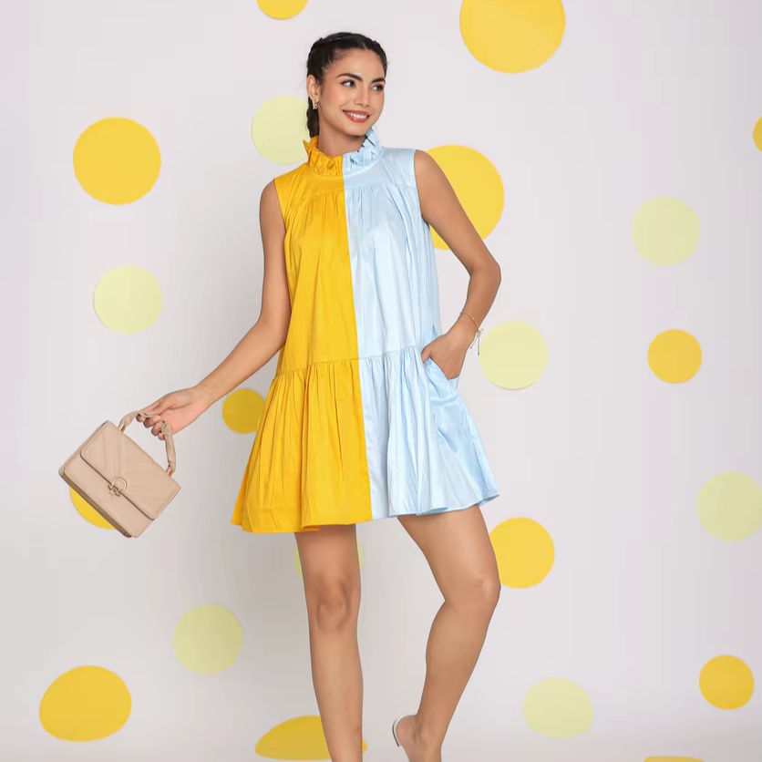 Product Name:Cotton Yellow And Ice Blue Relaxed Short & Mini Dress